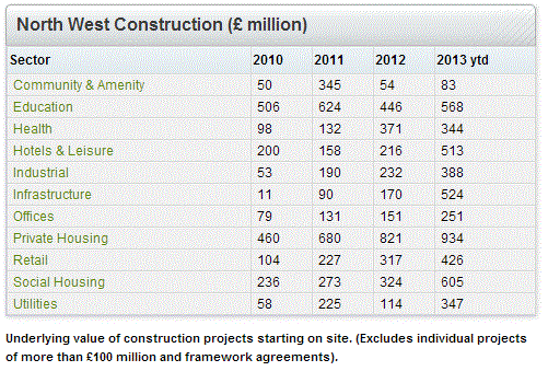 The Office for National Statistics reported that construction output in the region rose by 9% during the first half of 2013, with increases in both new work and repair and maintenance. The rise in new work came from every sector other than public non-residential work, which fell by 25%.. The sharpest increase came from industrial work, up 166% on the first half of 2012. Repair, maintenance and improvement work in the region also performed better than during the first half of last year, up by 7%.